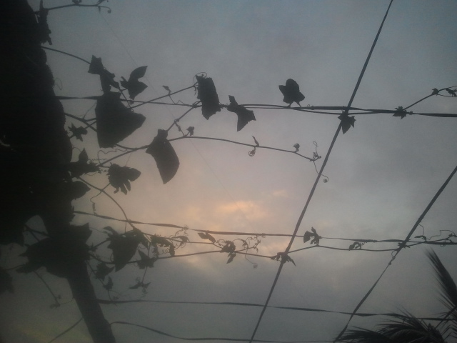 Tindora climbs the trellis, while dark monsoon clouds roam restlessly beyond